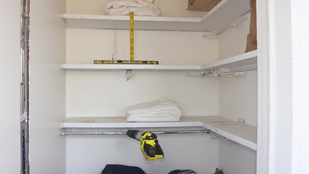 Adding adjustable shelves to a closet is a practical way to maximize storage space and adapt to changing needs. Begin by measuring the closet dimensions and determining the ideal height for each shelf based on the items you plan to store, such as taller spaces for boots or shorter ones for folded clothes. Choose adjustable shelving systems that can be easily repositioned using brackets or tracks to guarantee flexibility over time.
