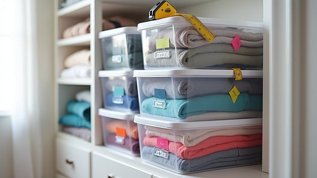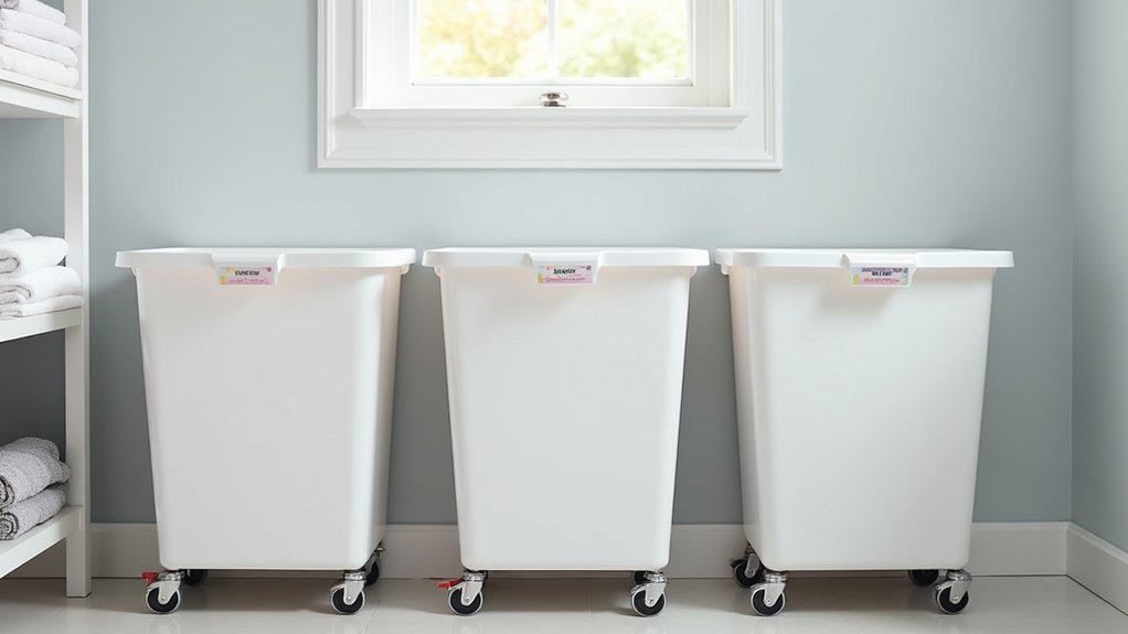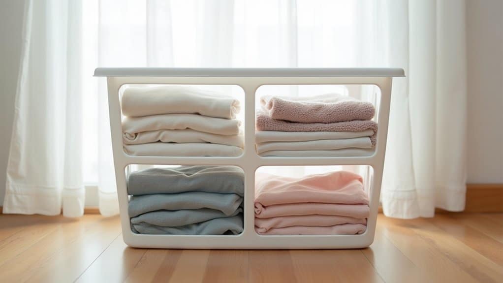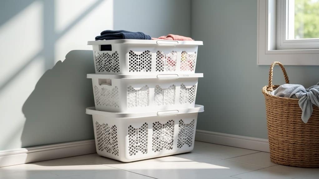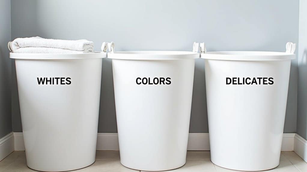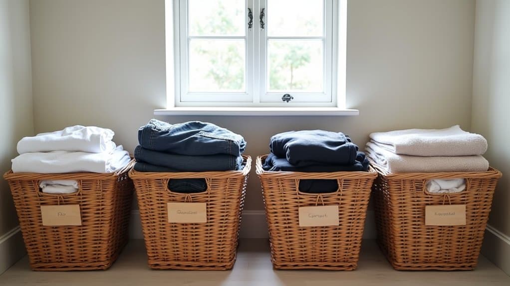 Organizing laundry baskets by clothing type is an effective way to streamline your laundry process and keep chaos at bay. Start by designating separate baskets for categories such as whites, darks, delicates, and towels or bedding. This method guarantees that similar items are washed together, reducing the risk of color bleeding or damage to delicate fabrics.