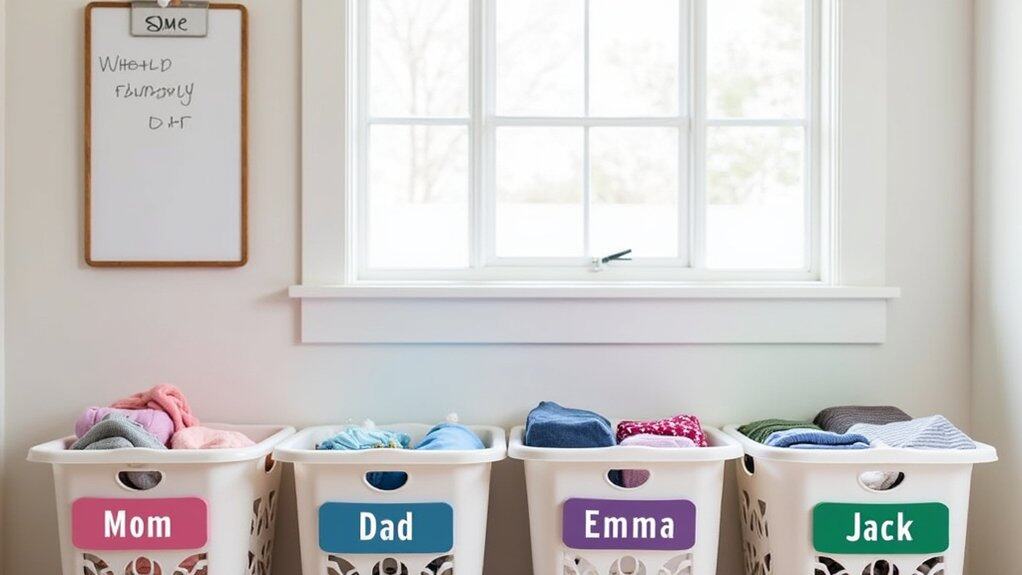 Organizing laundry baskets by family member is an effective way to streamline the laundry process and guarantee everyone’s clothing stays sorted. Start by assigning a specific basket to each person in the household, labeling it with their name or a unique color to avoid mix-ups. This method helps prevent confusion and makes it easy to distribute clean laundry to the right person.