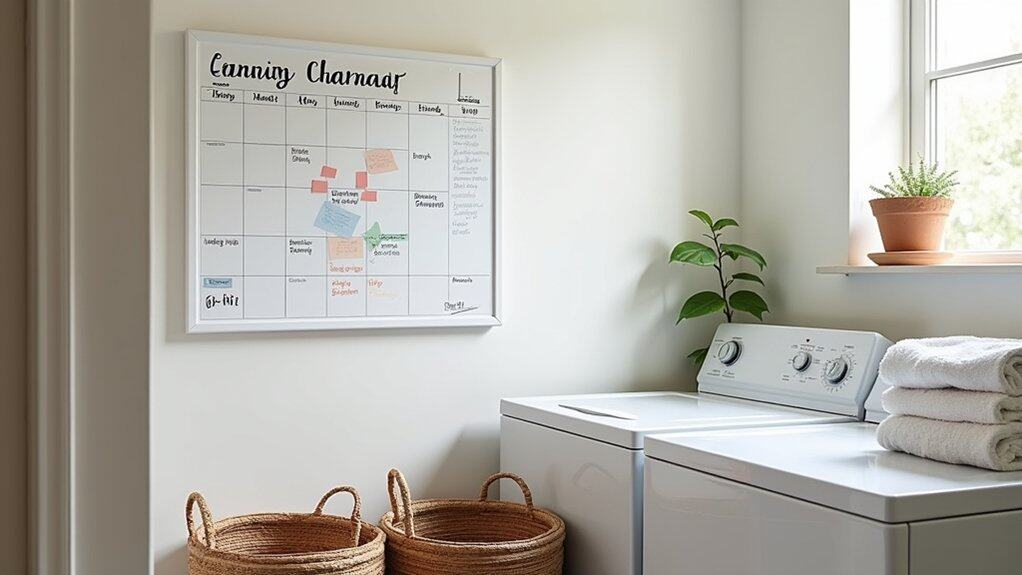 To make this schedule effective, communicate it with household members to guarantee everyone knows when laundry needs to be sorted or baskets need to be emptied. Consider creating a visible calendar or reminder system to track laundry days and assign tasks if you share responsibilities. This approach not only keeps your laundry baskets manageable but also reduces stress by turning laundry into a predictable, routine task.