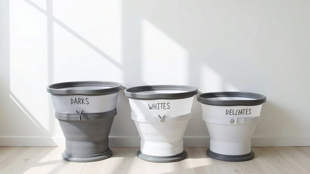 To incorporate foldable baskets effectively, designate specific baskets for different types of laundry, such as whites, darks, and delicates, and label them clearly to avoid mix-ups. Store collapsed baskets in a closet or under a bed when they’re not needed, maximizing your space efficiency. This approach keeps your laundry area tidy and guarantees that you can quickly set up or pack away your sorting system as needed.