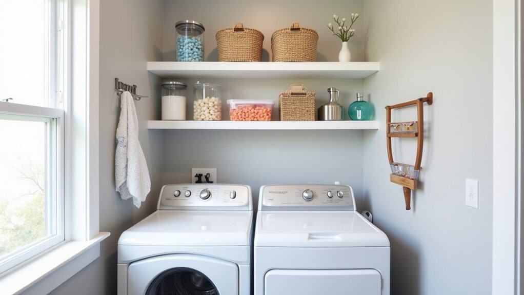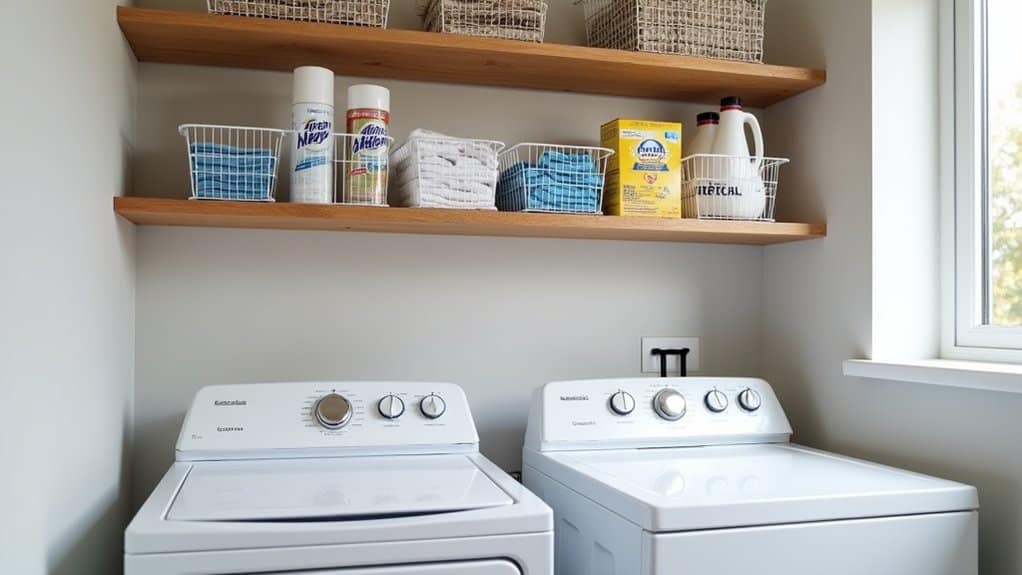 Gather the necessary tools, such as a drill, level, screws, and shelf brackets, and follow the manufacturer’s instructions for installing the shelves. Confirm the shelves are level before fully securing them to prevent items from sliding off, and consider adding baskets or bins to categorize supplies like detergent pods, dryer sheets, and stain removers. Once installed, arrange your laundry essentials neatly on the shelves to maintain a clutter-free and functional space.