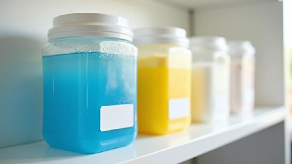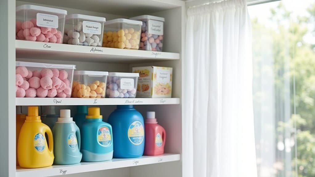 Labeling detergent containers is a simple yet effective way to keep your laundry supplies organized and easily accessible. Start by identifying each type of detergent or laundry product, such as liquid detergent, powder, fabric softener, or stain remover, and guarantee they are in distinct containers. Use waterproof labels or a label maker to clearly mark each container with its contents to avoid confusion during laundry routines.