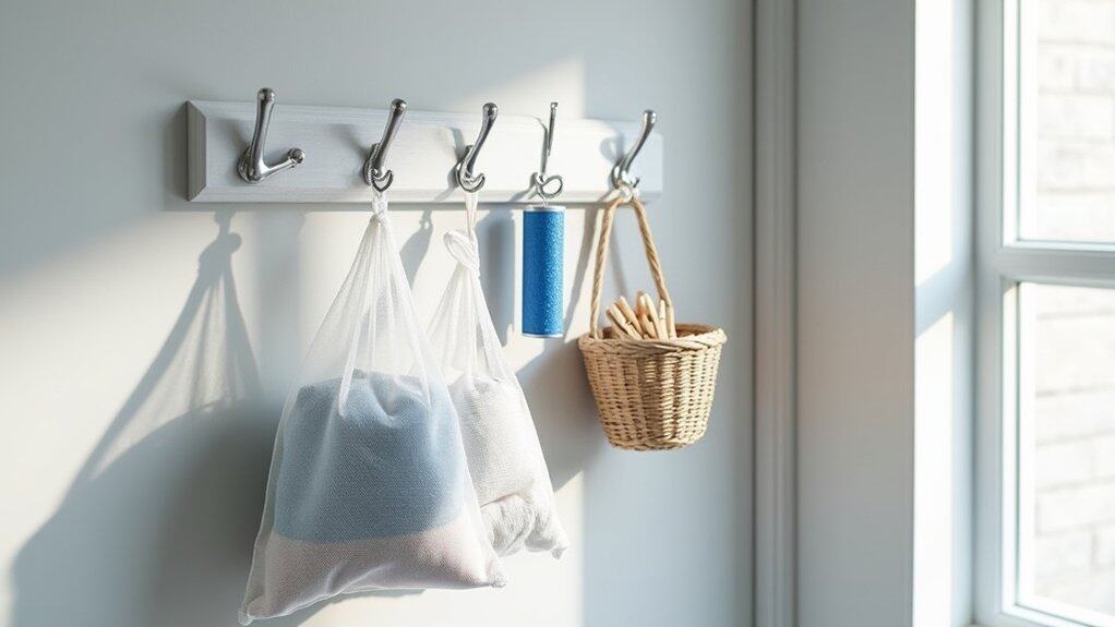 Installing door-mounted hooks is a practical solution for organizing laundry supplies, especially in small spaces where storage is limited. These hooks can be easily attached to the back of a laundry room door or a cabinet door, providing a convenient spot to hang items like dryer sheets, lint rollers, or even small baskets for odds and ends. Choose over-the-door hooks that are sturdy and fit the thickness of your door to guarantee they stay securely in place.