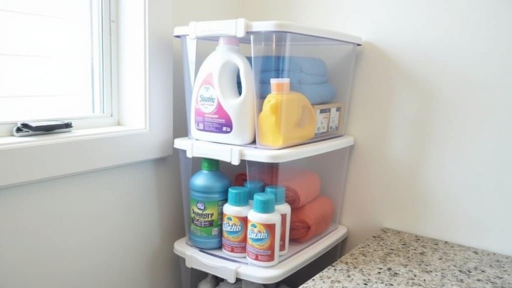 To implement this system, start by sorting your laundry supplies into categories, such as cleaning agents, fabric softeners, and tools like lint rollers or brushes, then assign each category its own bin. Verify the bins are stacked securely, with heavier items on the bottom to prevent tipping, and consider using bins with lids to protect contents from dust or spills. This method not only declutters your laundry space but also streamlines your routine by keeping supplies organized and within reach.