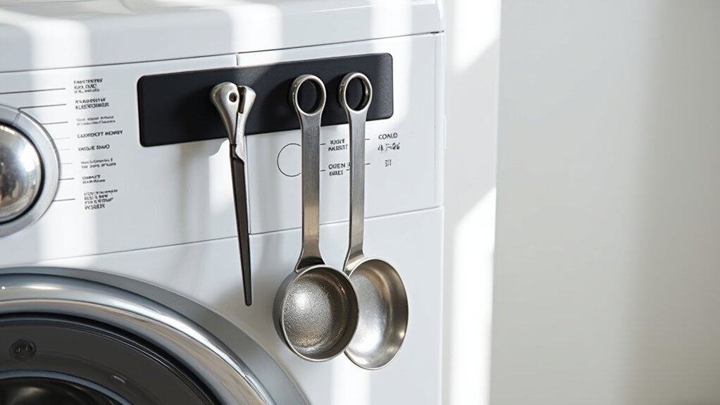 If your magnetic strip requires hardware for installation, use a drill to secure it with screws, making sure it is level for a neat appearance. Attach metal items like scissors, measuring spoons, or small containers with magnetic backs to the strip for convenient storage. This method not only saves space but also keeps frequently used tools visible and ready for quick access during laundry tasks.