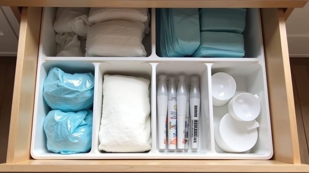 To implement drawer dividers effectively, start by measuring your drawer’s dimensions and selecting adjustable or custom-fit dividers that suit the space. Sort your laundry supplies by type or frequency of use, placing the most-used items in the most accessible sections. Regularly reassess and adjust the layout as needed to maintain order and accommodate new products.