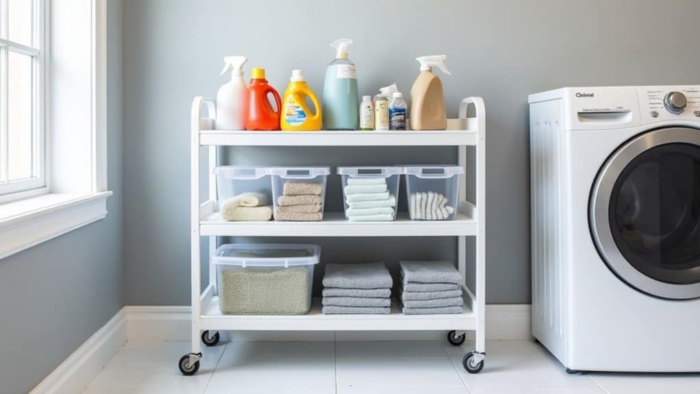 Sort your supplies into categorized sections on the cart, using the top tier for frequently used items and lower tiers for backups or less-used products. Consider adding small bins or dividers to separate smaller items like stain removers or clothespins, preventing clutter. This setup not only maximizes space but also allows you to move the cart if needed, adapting to your laundry routine.