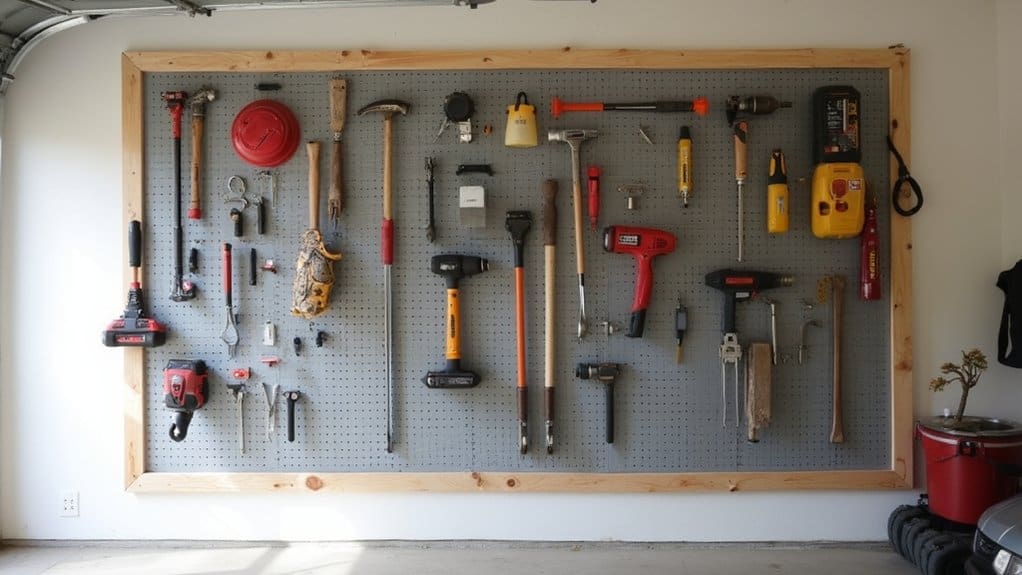 Attaching pegboard panels to the walls of a small garage is an excellent way to maximize storage space and keep tools and equipment visible and accessible. Start by measuring the wall area where you want to install the panels, guaranteeing there’s enough space for easy access and that the surface is flat and clean. Gather necessary materials like pegboard panels, furring strips or spacers, screws, a drill, and a level to guarantee proper installation.