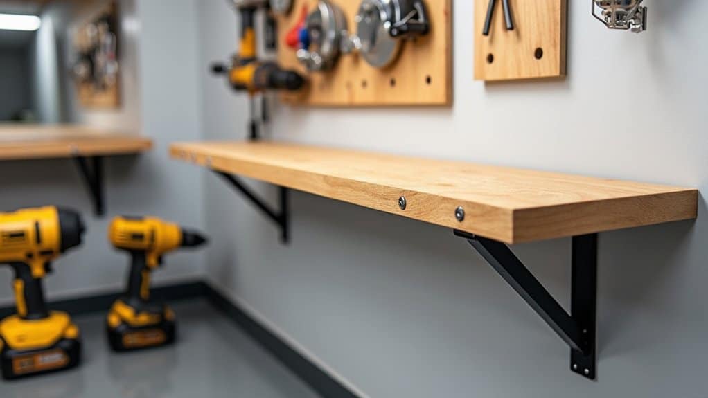 Once the brackets are installed, attach a sturdy, pre-cut plywood or MDF board to serve as the work surface, ensuring it folds down smoothly and locks in place when in use. Test the mechanism to confirm it operates without obstruction and folds up easily to save space when not needed. This setup provides a dedicated workspace without sacrificing valuable garage floor area.