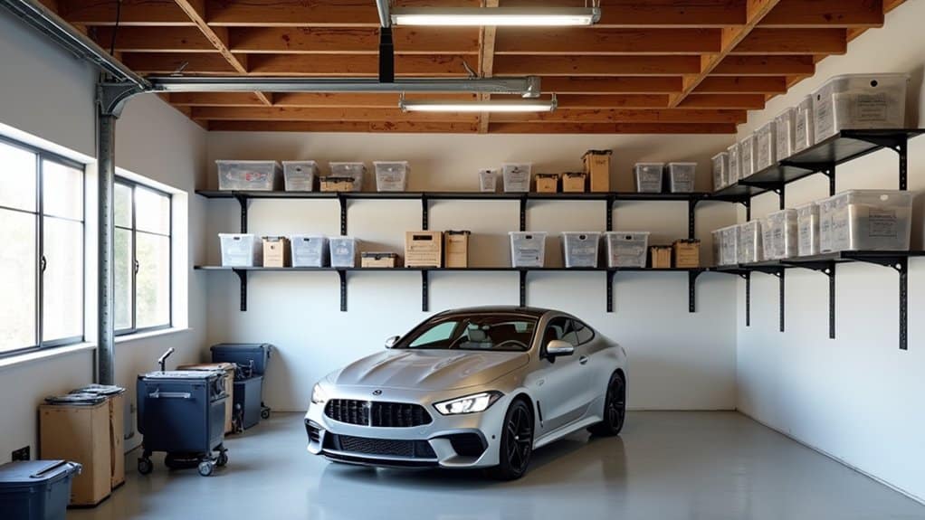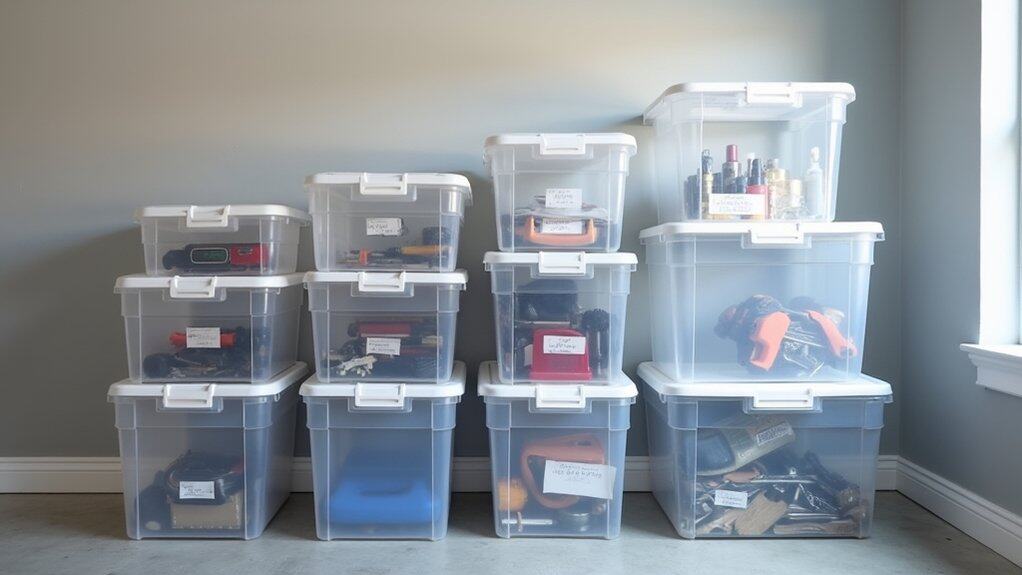 Stackable storage bins are a versatile and efficient solution for organizing your garage, offering a way to categorize and store tools, hardware, and other items with ease. Start by selecting bins of varying sizes based on the items you need to store, guaranteeing they are durable and designed to stack securely to maximize vertical space. Label each bin clearly with its contents, using a label maker or waterproof markers, to quickly identify what’s inside without needing to open them.