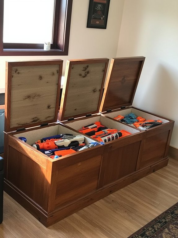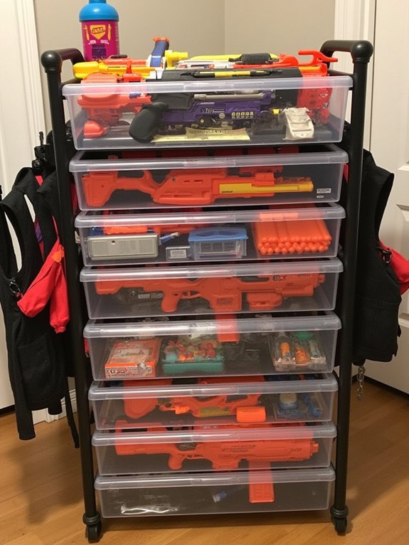 Under-bed storage bins offer a space-efficient solution for storing Nerf blasters while keeping them protected from dust and out of sight. These low-profile containers slide beneath most bed frames and feature clear plastic construction for easy identification of contents.