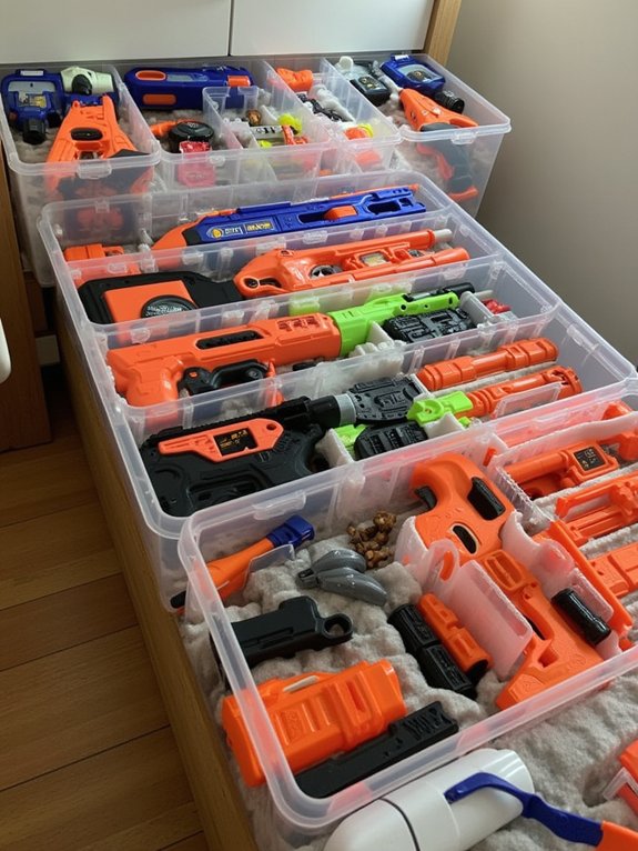 For optimal storage, stackable containers with minimum dimensions of 16×24 inches accommodate larger blasters. Waterproof labels help track contents, and silica gel packets prevent moisture damage. The clear design enables efficient organization while preserving the condition of the collection.