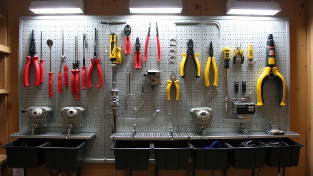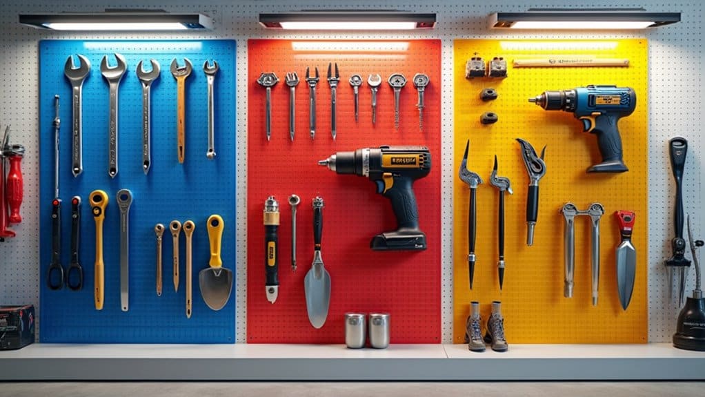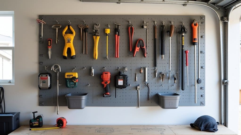 Creating custom storage solutions with pegboards in your garage allows you to tailor the space to your specific needs. Start by evaluating the tools, equipment, and items you use most frequently, then sketch a layout for hooks, shelves, and bins on the pegboard to accommodate them. This personalized approach guarantees that everything has a designated spot, making it easy to find and access.