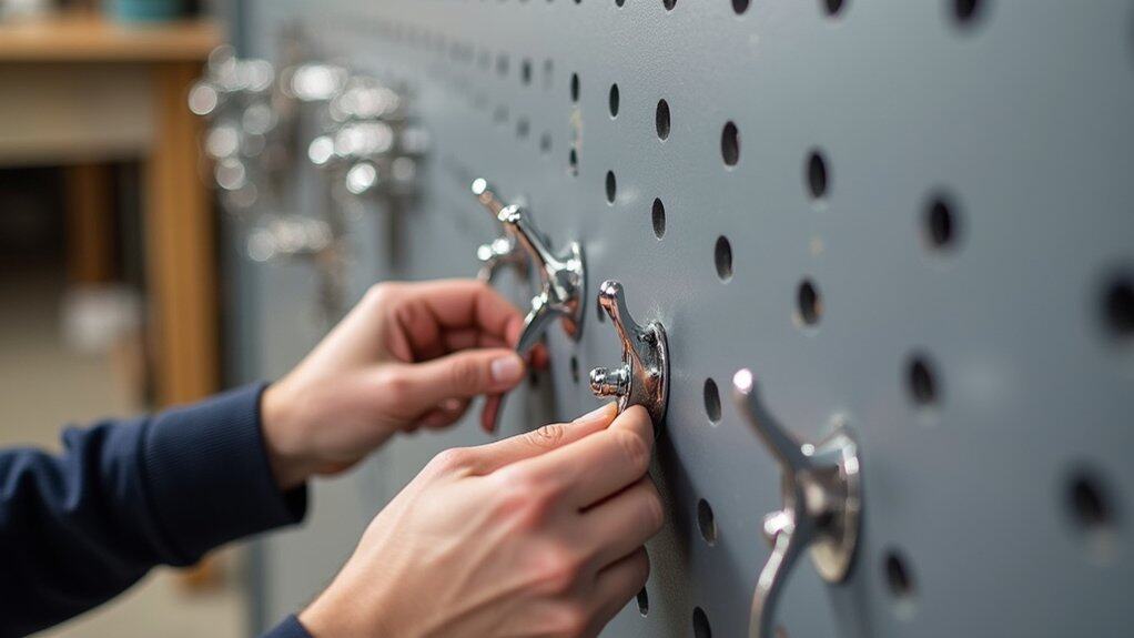 Installing pegboard hooks is an essential step in customizing your garage organization system to fit your specific storage needs. Begin by evaluating the tools and items you plan to hang, then select the appropriate hook types, such as single hooks for lightweight items like screwdrivers or double hooks for heavier tools like hammers. Verify the hooks are compatible with the pegboard’s hole size and spacing for a secure fit.
