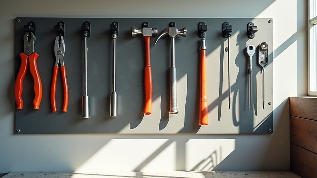 To hang these tools effectively, use pegboard hooks, brackets, or specialized holders designed for specific items to secure them in place. Arrange the tools in a logical order, such as grouping all screwdrivers together or placing related tools near each other, to create an intuitive system. Confirm the hooks are firmly inserted into the pegboard holes and test the stability of each tool’s placement to prevent accidental falls or damage.