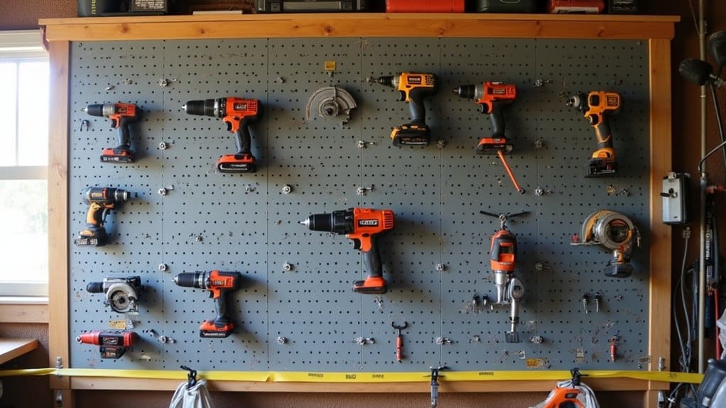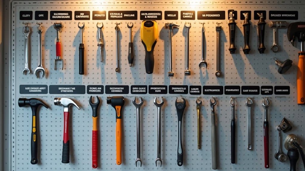 When organizing your garage using pegboards, hanging frequently used tools is an essential step to guarantee easy access and maintain a clutter-free space. Start by identifying the tools you use most often, such as hammers, screwdrivers, and pliers, and group them by type or purpose for quick retrieval. Place these items at eye level or within arm’s reach on the pegboard to minimize effort and save time during projects.