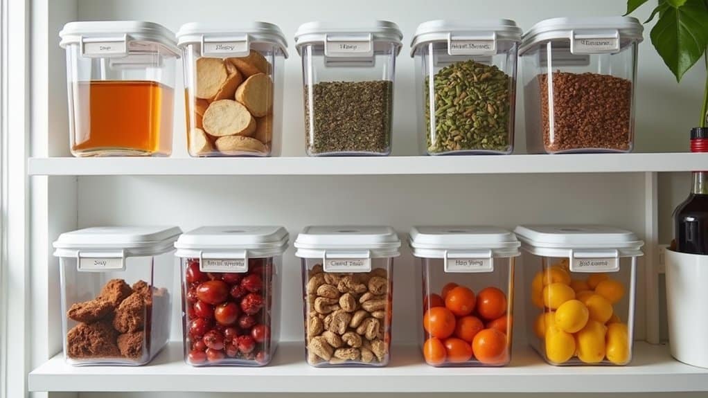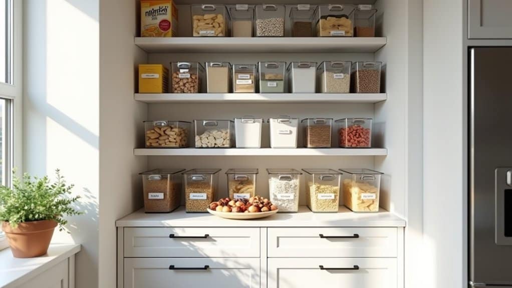 To maintain this system, always measure or estimate container sizes before purchasing new items to ascertain they fit within your designated categories. Use clear, stackable containers when possible to create uniformity and save space, especially for bulk goods that come in awkward packaging. Label each container or bin with its category or contents to quickly identify where items belong during restocking. Regularly review and adjust the organization as your inventory changes, rotating older items forward to prevent expiration and ascertain a tidy, accessible pantry.