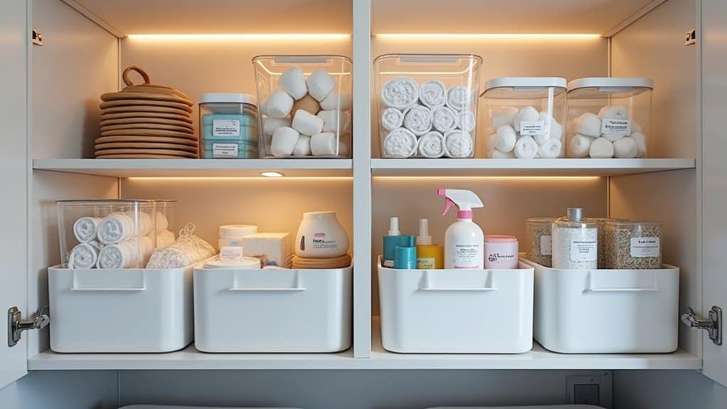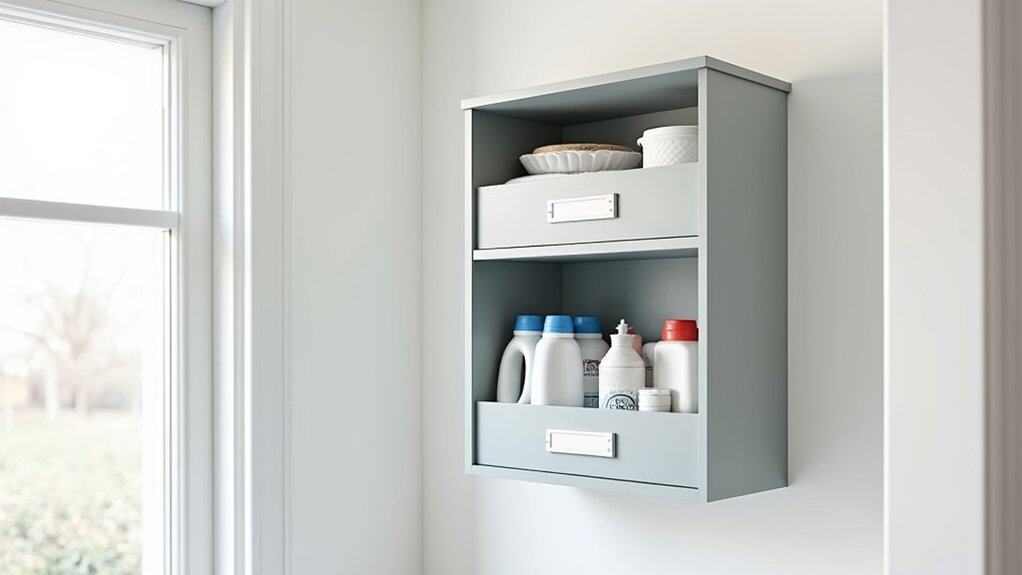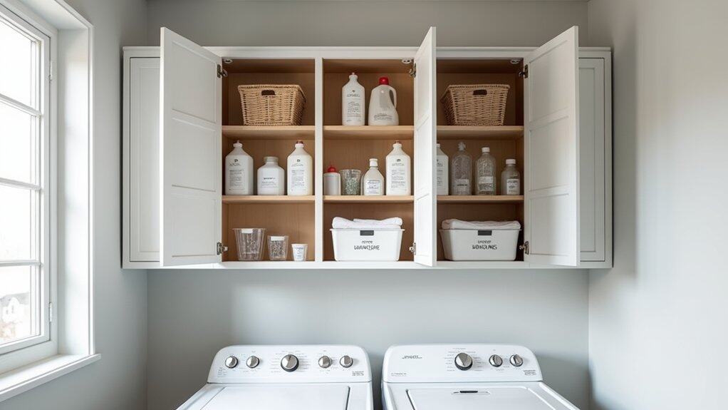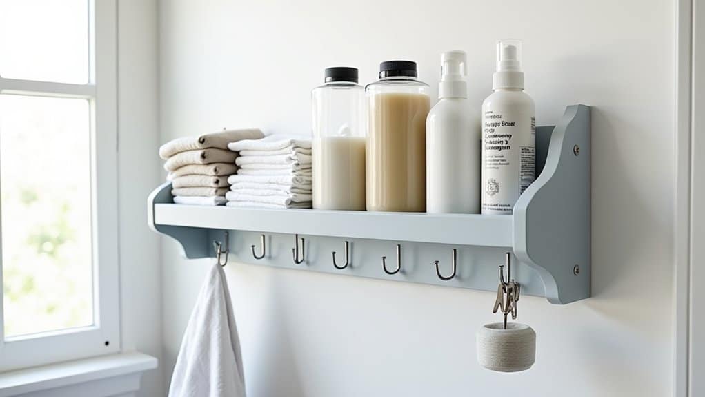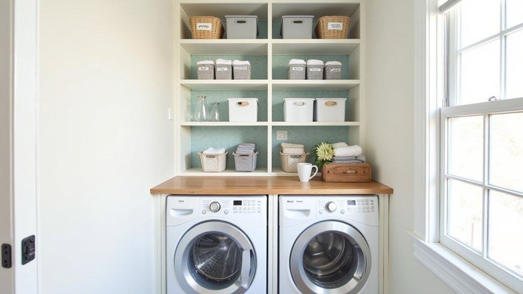 For an added touch of functionality and style, consider painting the BILLY bookcase or adding peel-and-stick wallpaper to match your laundry room decor. Doors can be attached to some models to conceal clutter and create a streamlined look, while labeling bins or shelves guarantees everything has a designated spot. This budget-friendly hack not only maximizes vertical storage but also keeps your laundry room organized and visually appealing.