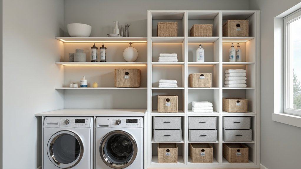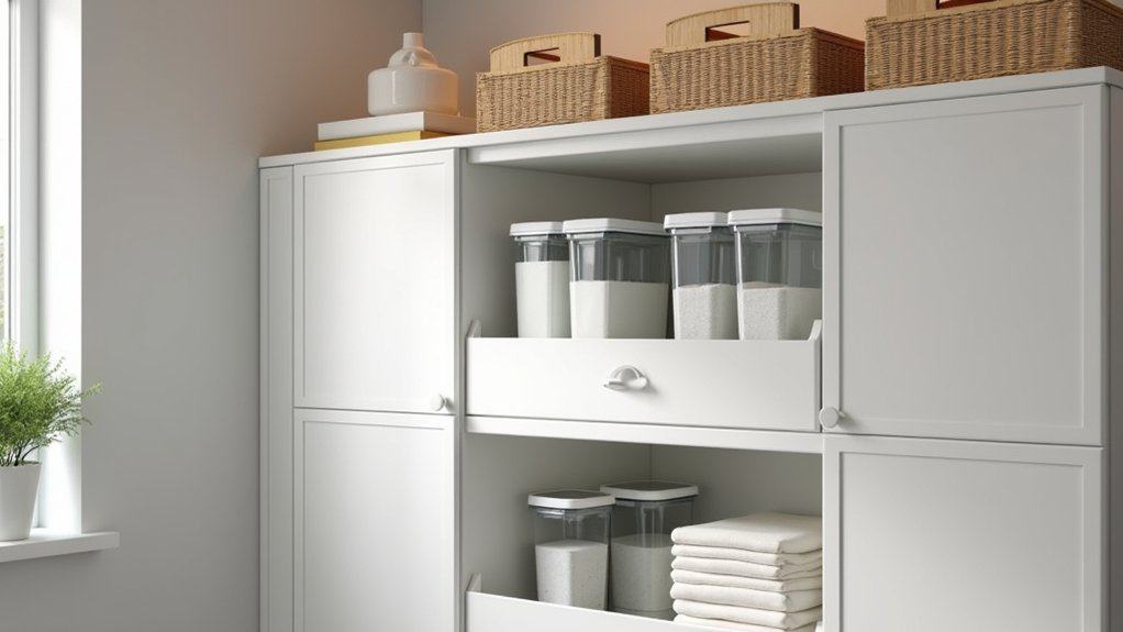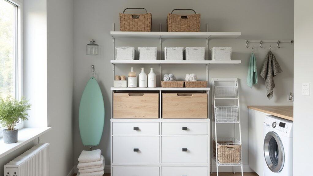 To maximize functionality, add doors or drawers to the IVAR cabinet to conceal clutter and maintain a tidy appearance. Use labeled bins or baskets inside the shelves to categorize smaller items like clothespins or dryer sheets, making them easy to locate. This modular system also allows you to expand or reconfigure as your storage needs change, keeping your laundry room both organized and adaptable.