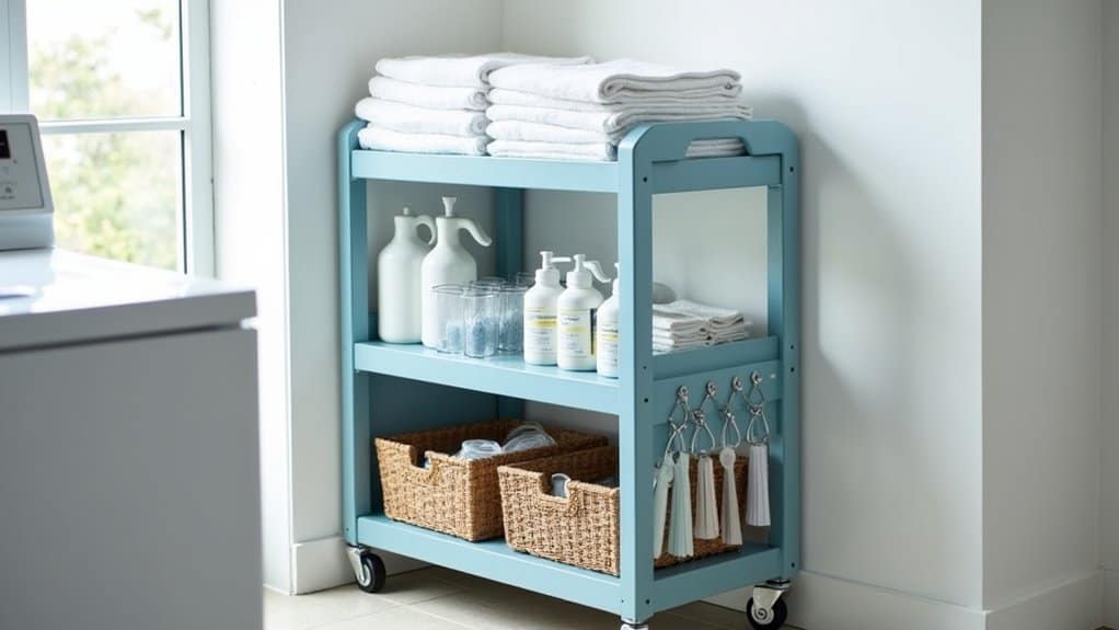 To maximize the cart’s potential, consider customizing it with additional IKEA accessories like S-hooks or small baskets to hang or store smaller items such as clothespins or stain removers. Label each tier or basket to quickly identify contents, streamlining your laundry process. This setup not only saves space but also adds a touch of organization and style to your laundry room with its sleek, minimalist look.