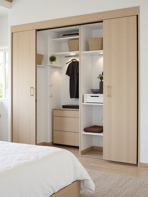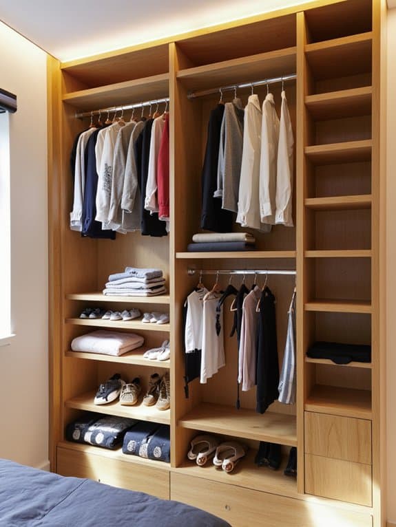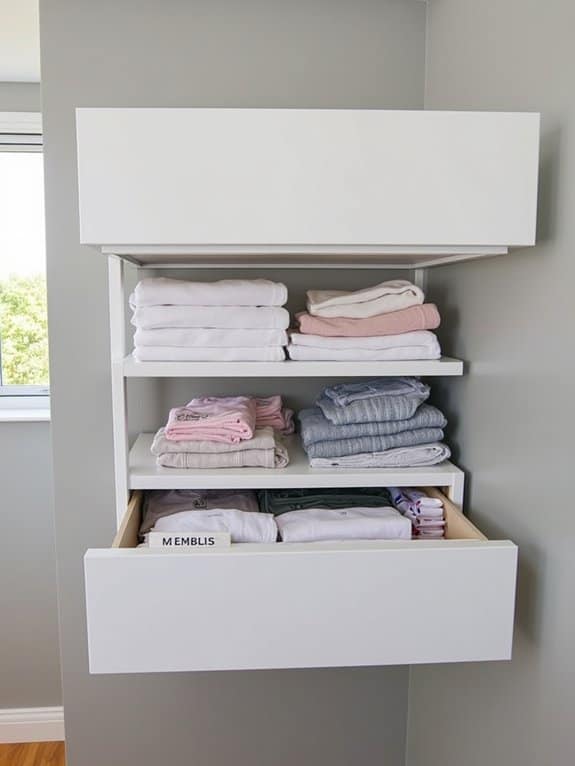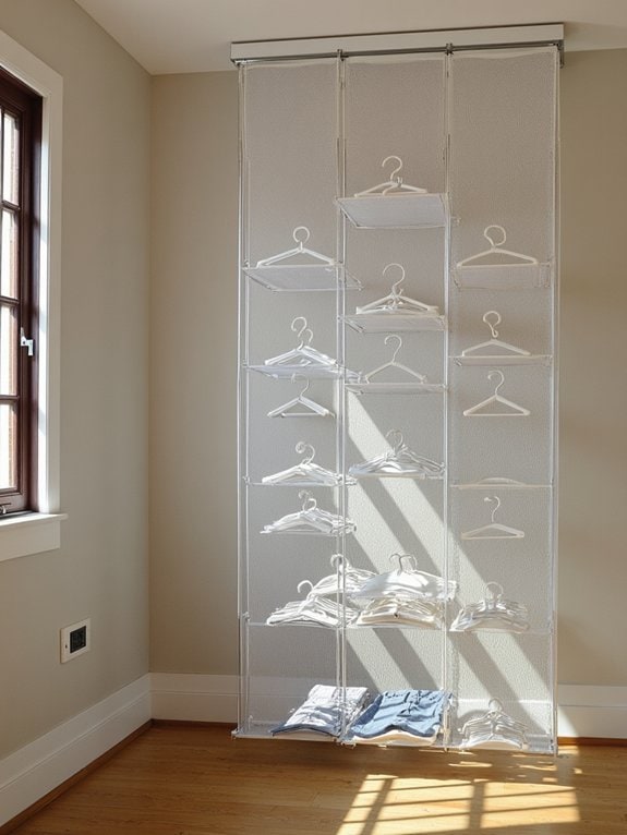 For optimal functionality, install adjustable dividers 12 inches apart using smooth-rolling mechanisms that won’t damage delicate fabrics. Clear or mesh materials allow easy visibility of contents, while labeled tabs help quickly identify clothing categories. This system works especially well in small spaces where efficient organization is crucial.