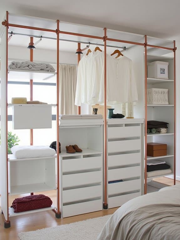 Industrial wall pipes offer a bold storage alternative that combines functionality with modern industrial style. By mounting clothing rods directly to walls using pipe fixtures, you create an exposed storage system that’s both sturdy and visually striking.
