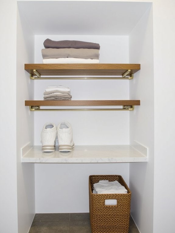 Floating drawer units offer an elegant storage solution by utilizing vertical wall space while keeping floors clear. These units, installed 30 inches apart vertically, provide easy access to folded clothes and accessories without taking up valuable floor area.