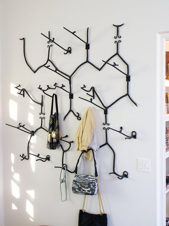 Wall-mounted storage hooks transform empty wall space into functional storage areas while saving valuable floor space. Unlike freestanding racks, these permanent fixtures keep clothing, bags, and accessories organized and easily accessible, particularly when installed near entryways for convenient access.