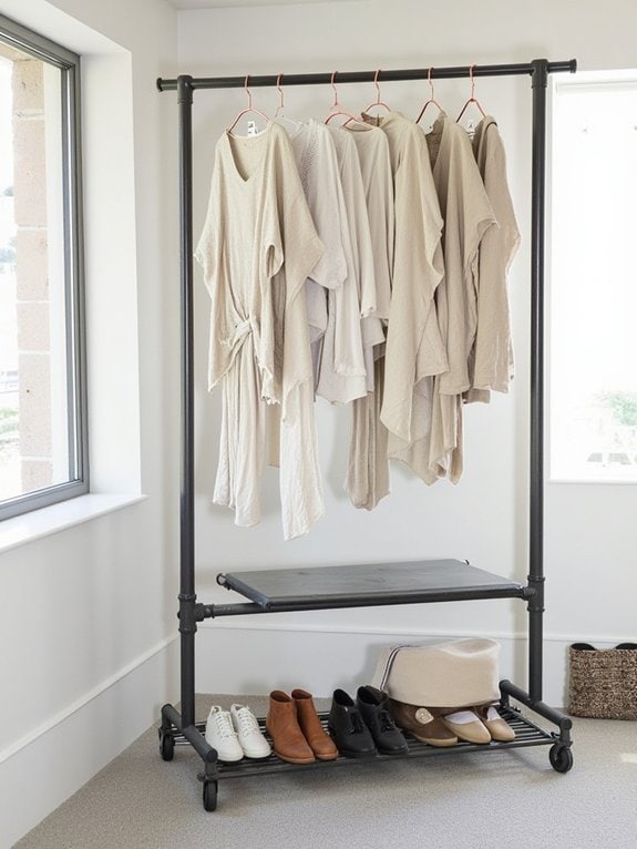 The market offers diverse garment rack designs to complement any interior style, including industrial pipe configurations and modern chrome finishes. These versatile storage solutions provide an organized way to display and access clothing while maintaining a clean, functional aesthetic in your space.