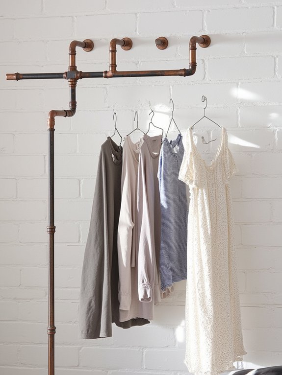 The design requires horizontal pipes mounted 12-18 inches from walls for hanging clothes, with vertical supports every 4 feet for stability. Using dark iron or brass fixtures provides an authentic industrial appearance, while adding wooden shelves between pipes accommodates folded items. The 1-1.5 inch pipe diameter ensures optimal strength while the entire system doubles as distinctive wall decor.
