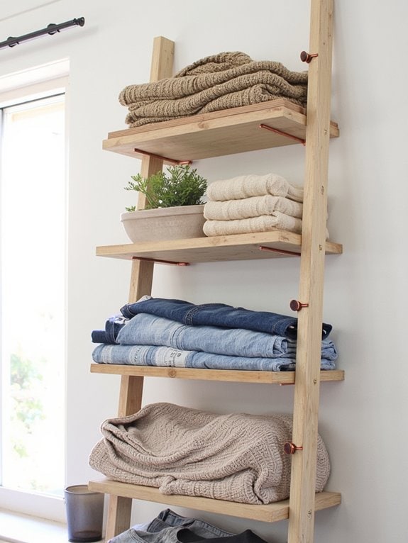 The ladder shelf can be customized with hooks on the sides for hanging accessories, baskets for smaller items, and wider bottom rungs for folded clothing. When properly anchored at a slight angle against the wall, this upcycled piece provides both vertical storage space and decorative appeal.
