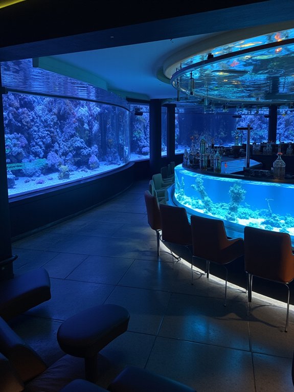 The room’s design incorporates marine artwork, coral-inspired decorative elements, and strategic blue LED lighting behind furniture pieces. A carefully positioned seating arrangement faces the main aquarium, while a subtle waterfall feature adds authenticity to the underwater atmosphere. This thoughtful combination of elements delivers a truly captivating aquatic environment.