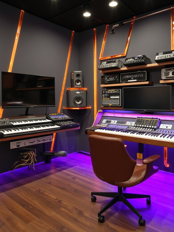 The studio setup includes essential tools for modern music production, from MIDI controllers and drum machines to mixing consoles. A comfortable collaboration area allows musicians to work together, while acoustic panels and bass traps ensure optimal sound quality throughout the space.
