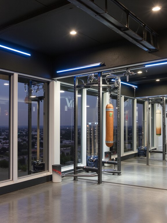 The studio optimizes functionality through strategic equipment placement, including cardio machines along walls, a dedicated strength zone, and a serene yoga corner. With the addition of streaming capabilities and a nutrition station, this personalized space eliminates common barriers to exercise while promoting healthy habits and consistent training.