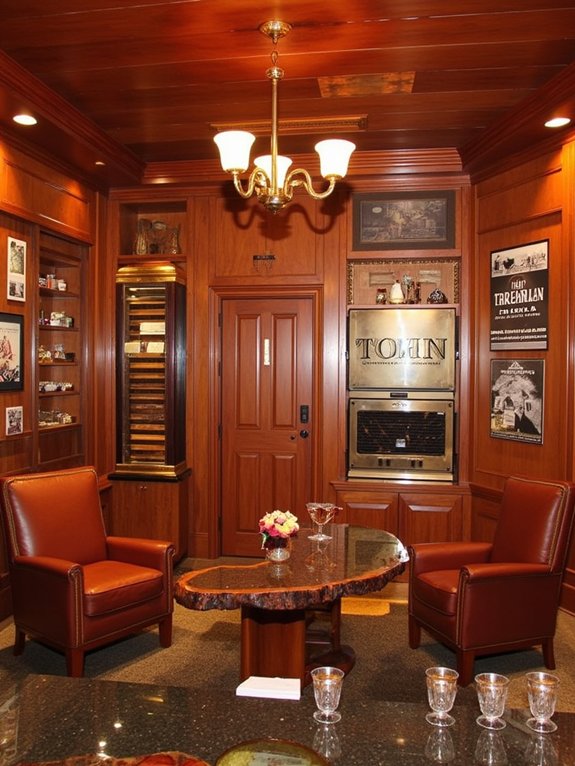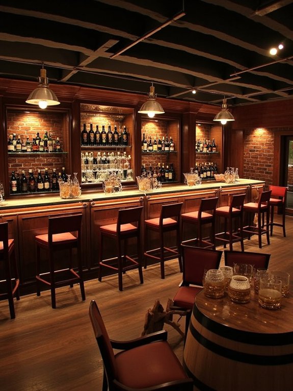 The space combines functionality with sophistication through essential features including proper storage, temperature control, and a dedicated serving station equipped with specialized glassware. Comfortable leather seating and a filtered water station complete this refined sanctuary, allowing for proper whiskey evaluation and cocktail preparation in an elegant atmosphere.