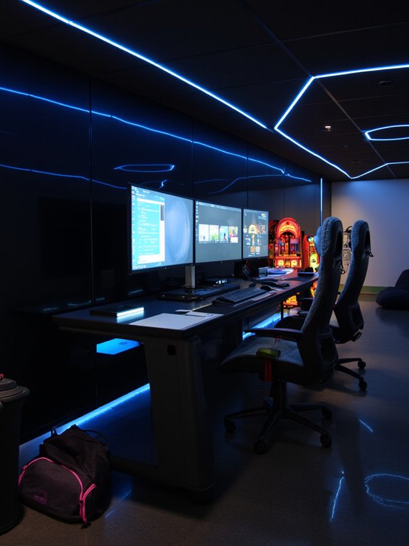 The space features multiple gaming stations equipped with 4K displays and ergonomic seating, alongside a dedicated VR zone with safety features. Complementary amenities include a refreshment area, professional-grade soundproofing, and customizable RGB lighting, creating an immersive atmosphere perfect for extended gaming sessions and tournaments.