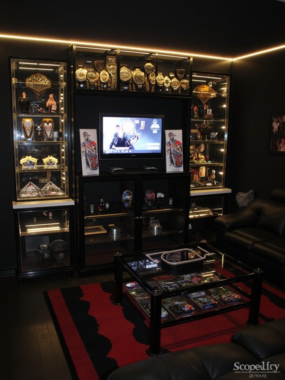 Complete the atmosphere with mounted championship belts, autographed collectibles, and wrestling artwork displayed on themed wall sections. Include practical amenities like a mini fridge and snack station to keep fans fueled during extended viewing sessions of live events and classic matches.