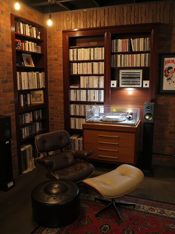 The essential elements include acoustic treatments, a high-quality turntable setup, comfortable seating, and proper lighting. Wall-mounted shelving displays the record collection, while vintage concert posters and music memorabilia add character to the space. This thoughtful combination of functional and decorative elements creates an environment where both sound quality and aesthetics enhance the listening experience.