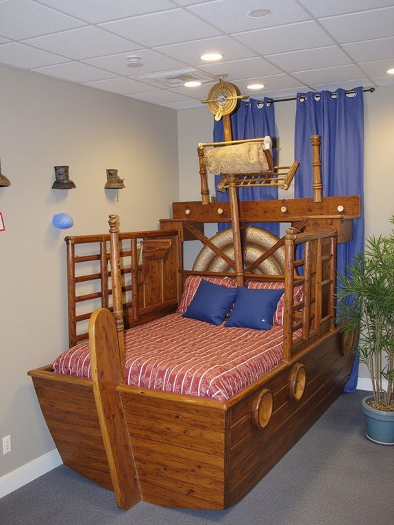 This custom pirate ship captain’s bed brings high-seas adventure into a child’s bedroom. The bed frame features wooden railings, a removable steering wheel at the foot, and hidden storage compartments beneath for treasure. A fabric sail mounted overhead and decorative rope accents complete the nautical theme.