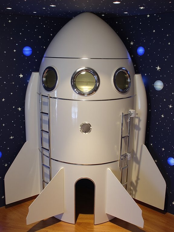 The rocket ship bunk bed combines space-saving functionality with imaginative play, featuring a vertical design that transforms a regular bedroom into an outer space adventure. The bed’s frame incorporates cosmic elements like control panels, LED lighting, and themed storage compartments to create an immersive experience.