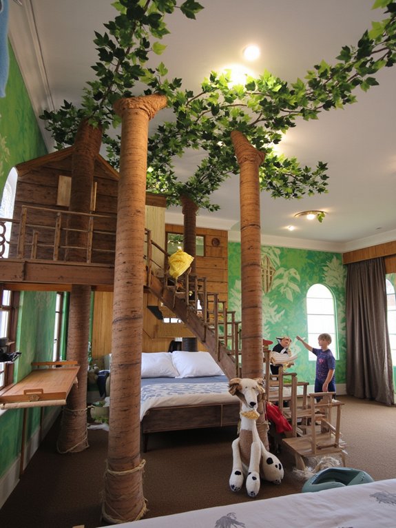 A jungle treehouse loft bed elevates a standard sleeping space into an immersive adventure zone. The design combines natural elements like artificial vines, leaf canopies, and tree trunk-inspired storage with practical features including safety railings and secure climbing access. This creates a magical forest sanctuary within a child’s bedroom.