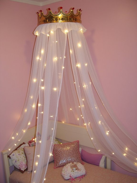 A princess castle bed canopy creates a magical bedroom retreat featuring flowing fabric walls and a crown-topped design. By mounting sheer tulle panels from a ceiling crown and adding twinkle lights, the space transforms into an enchanted castle perfect for both rest and play.