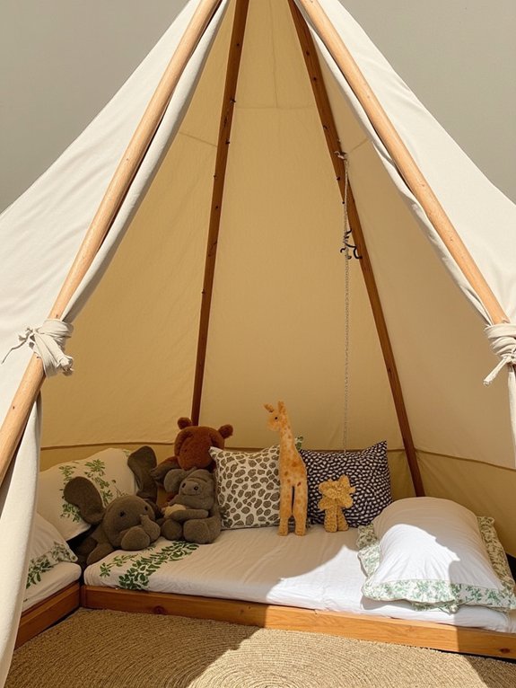 Transform a child’s bed into a magical safari cave retreat by draping brown fabric in a cave-like canopy formation over the sleeping area. LED string lights woven through the fabric create the effect of starlight filtering through tree branches, while plush safari animals stand guard as friendly companions.