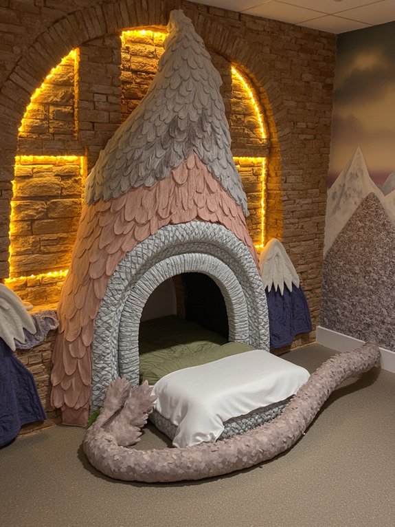 Transform a child’s bed into a mythical dragon’s lair with sculpted cave-like walls, textured stone surfaces, and dramatic lighting effects. The design features curved wooden panels surrounding the bed frame, creating an immersive cave environment complete with dragon scale patterns and themed accessories.