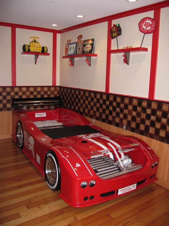 The immersive experience can be enhanced with themed accessories like LED underglow lighting, checkerboard wall patterns, racing flags, and pit stop decals. Storage solutions disguised as tool boxes or fuel tanks add functional authenticity, while a racing helmet display area creates a personal pit crew station that completes the high-speed atmosphere.