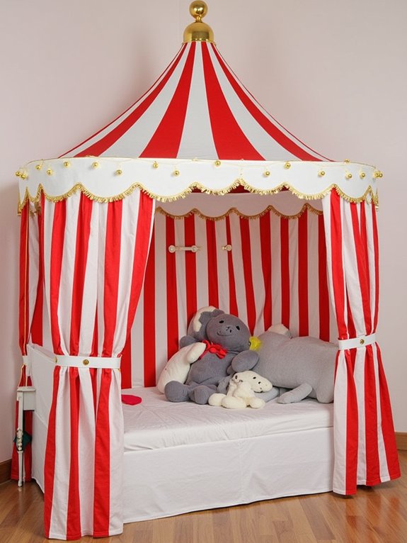 A circus tent-style canopy transforms a child’s bed into a whimsical big-top environment. The design features a red and white striped fabric extending from ceiling to bed corners, creating a cozy sleeping space reminiscent of a circus tent.