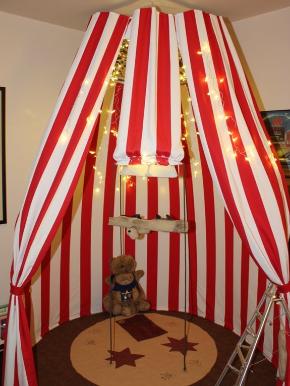 Key features include red and white striped curtains, plush circus animals, vintage performance posters, and starburst-patterned string lights. These elements work together to recreate the excitement and wonder of being under the big top, providing a unique and playful space for young dreamers.