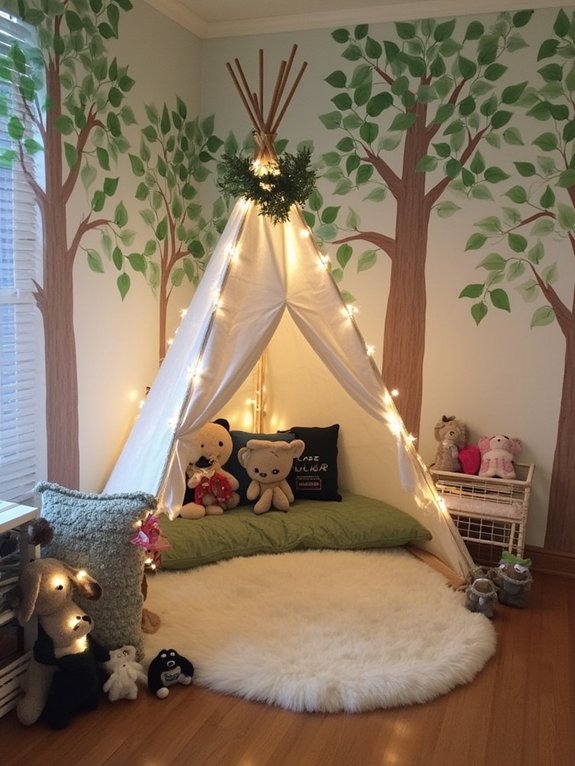 A cozy forest reading nook transforms an ordinary bedroom corner into a magical retreat for toddlers. By incorporating soft green elements, woodland-inspired decor, and dimmable twinkling lights, the space sets the perfect backdrop for storytime adventures.