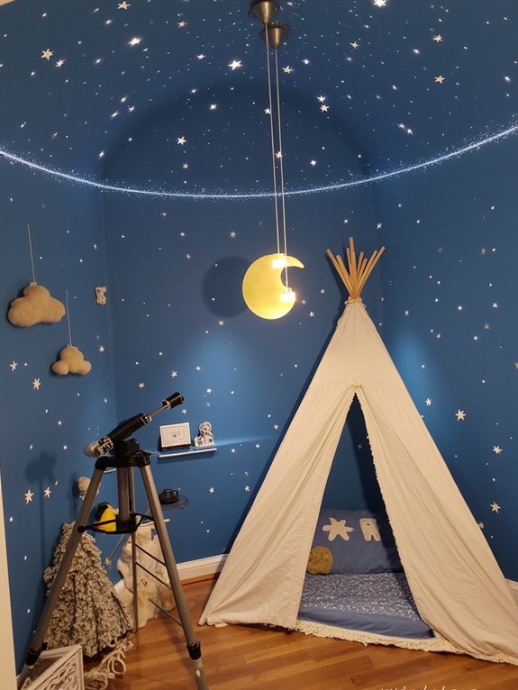 A moonlit stargazing corner creates a magical astronomical hideaway in a toddler’s bedroom. By combining a star projector, cosmic artwork, and educational elements like star maps and space-themed books, this dedicated area inspires wonder about the night sky and fosters early interest in space exploration.